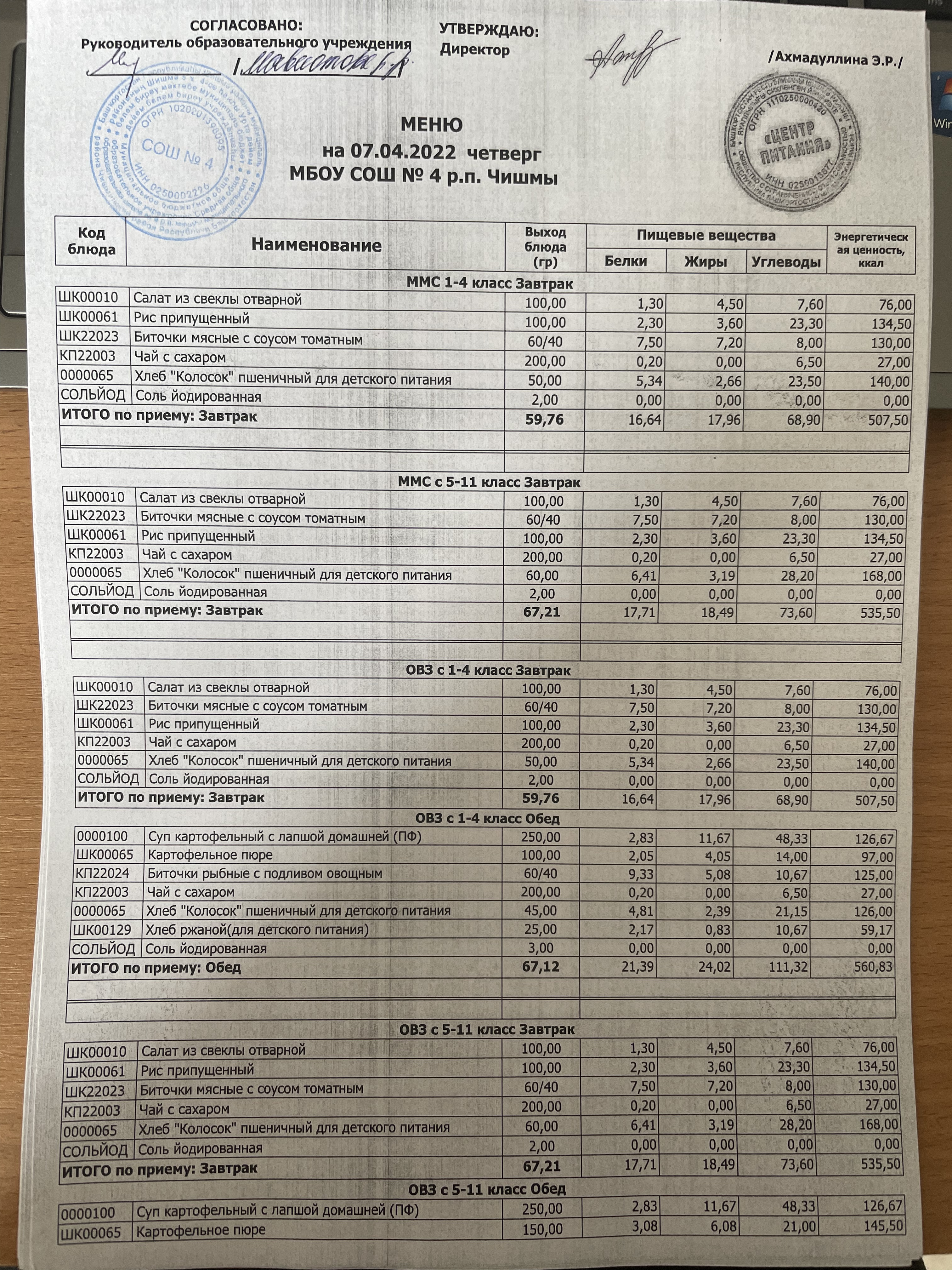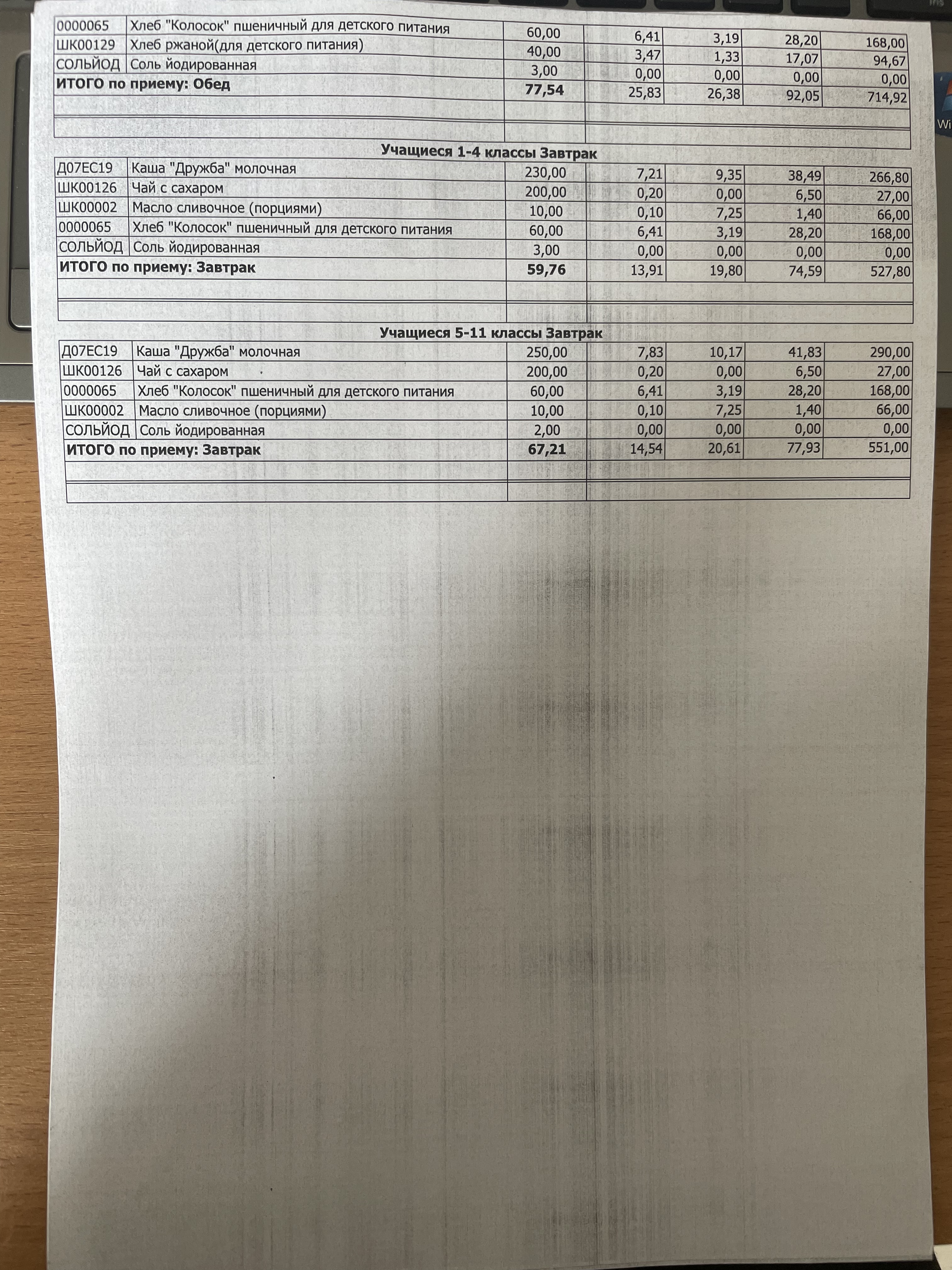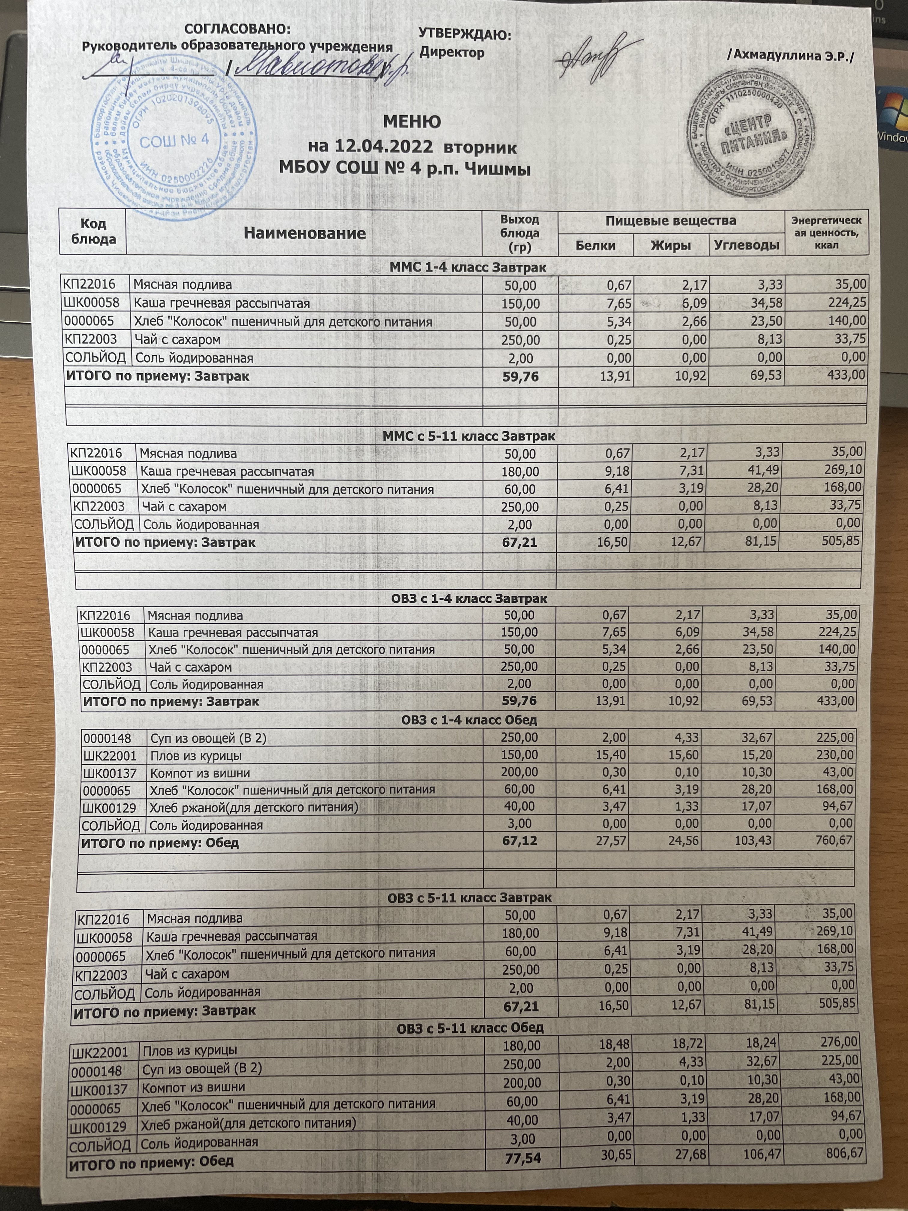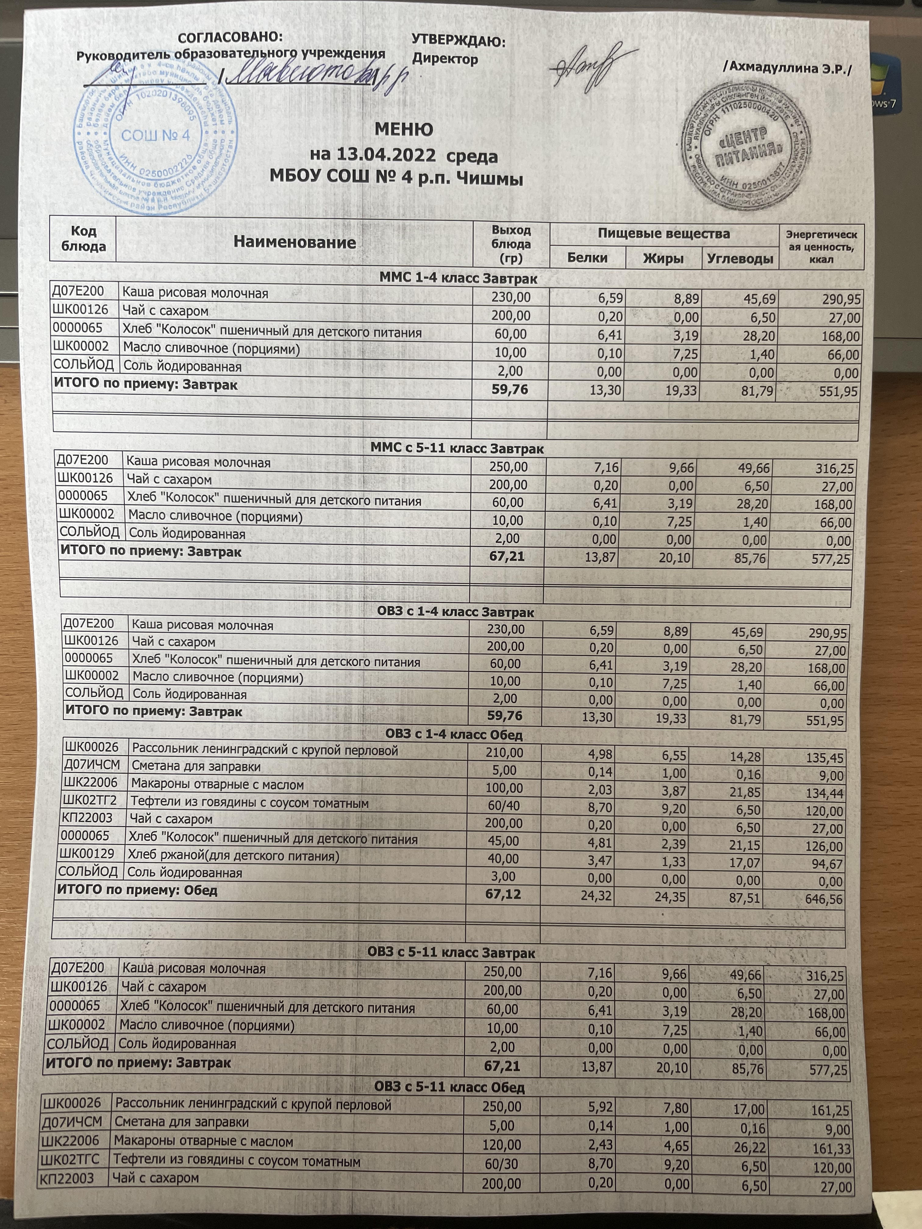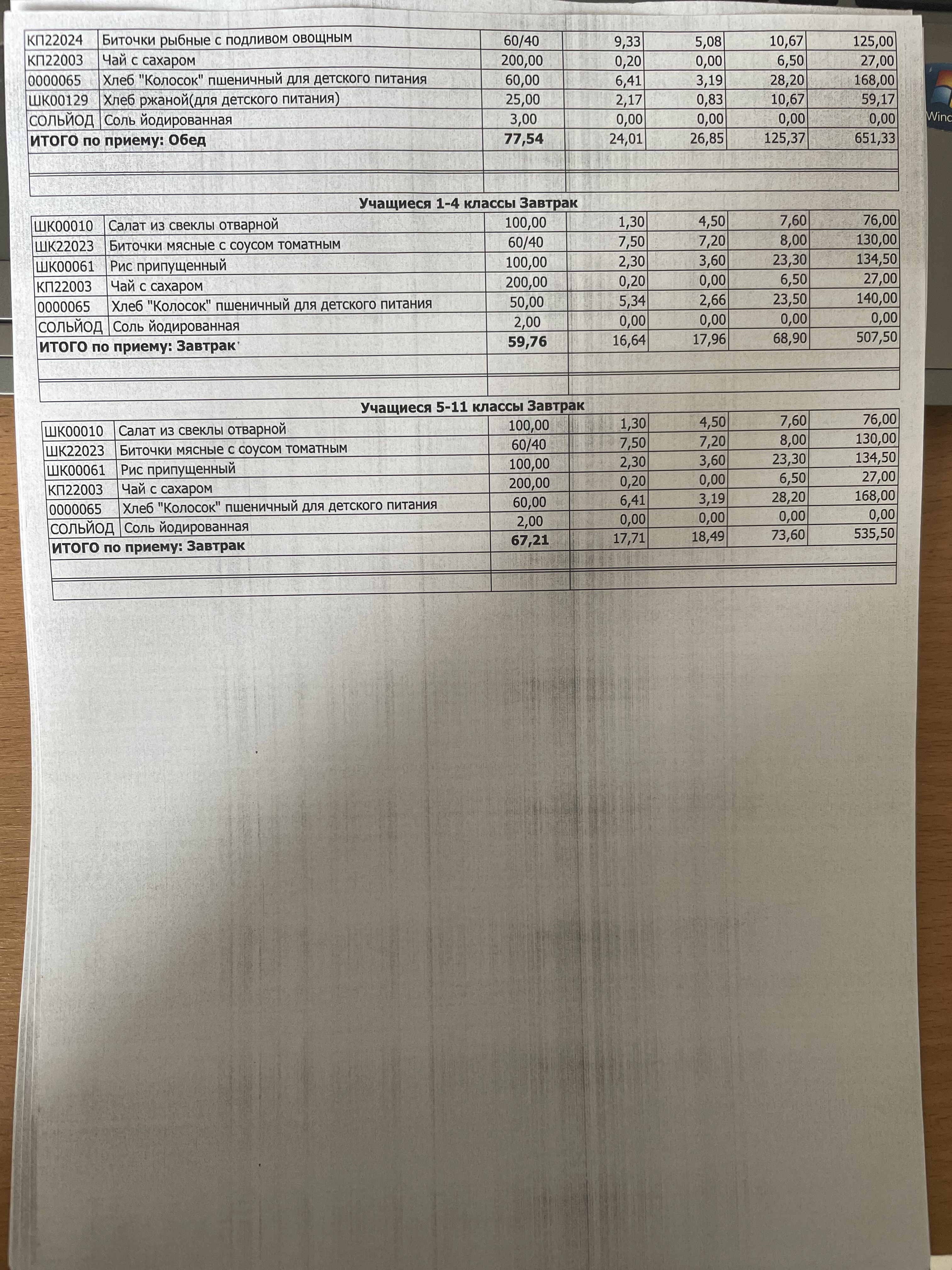 (Фото контрольных блюд )