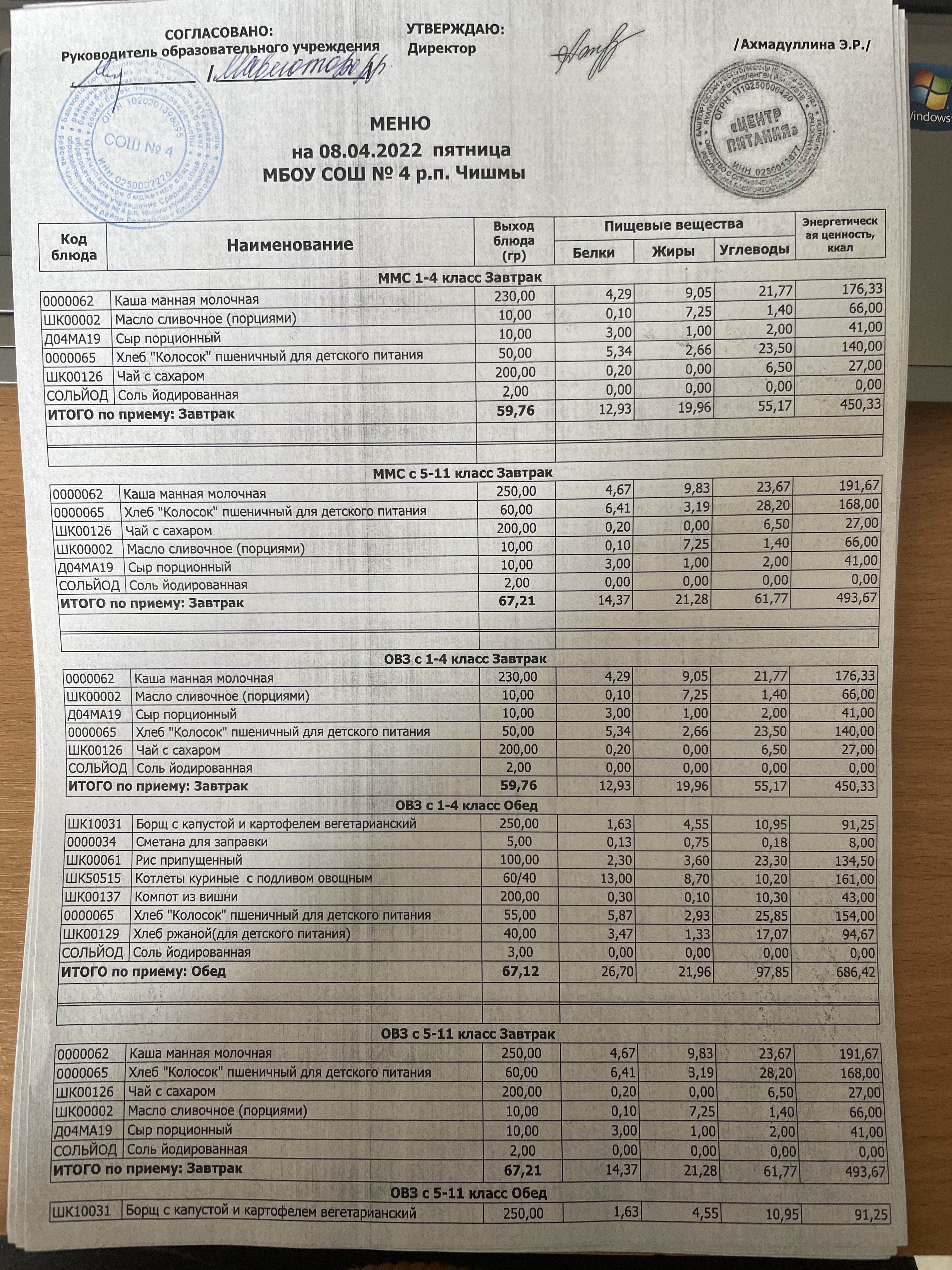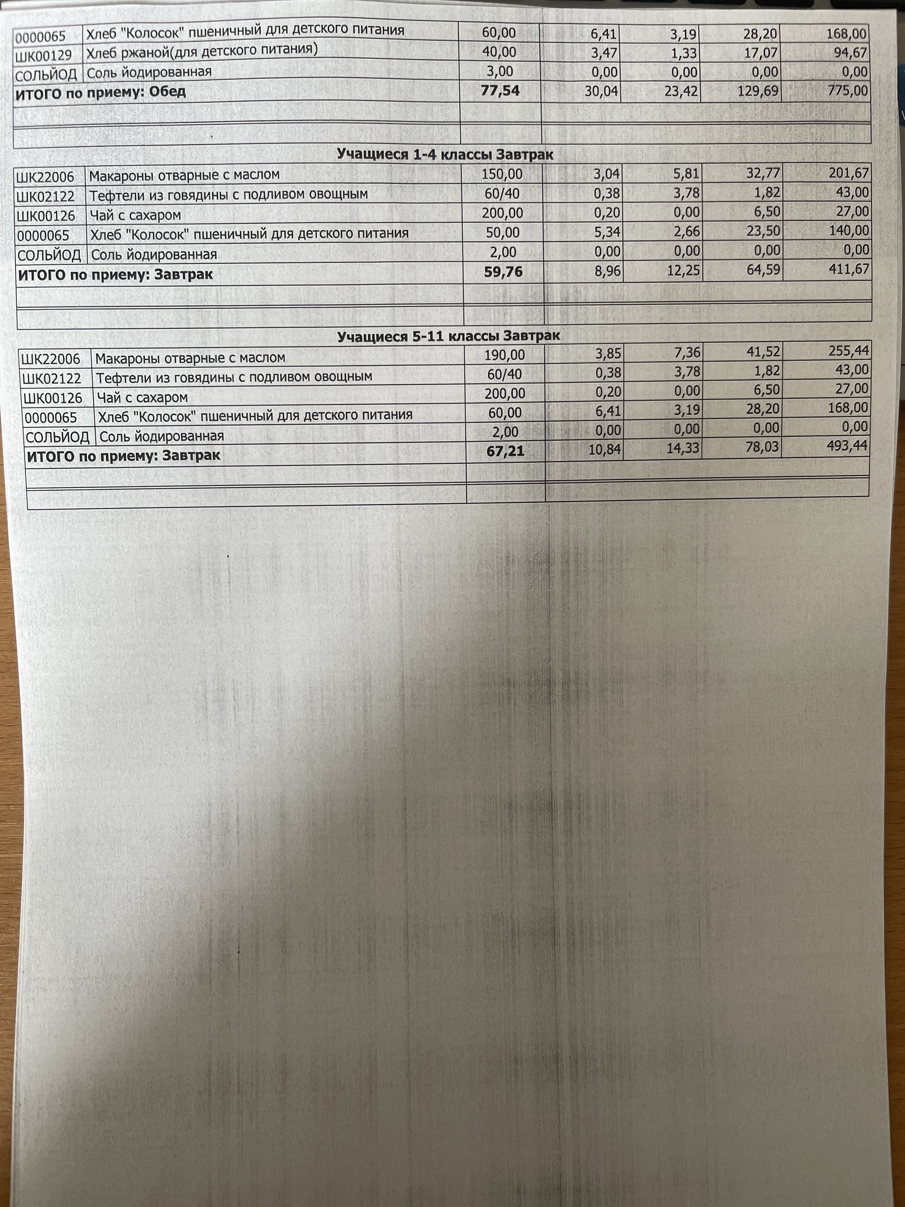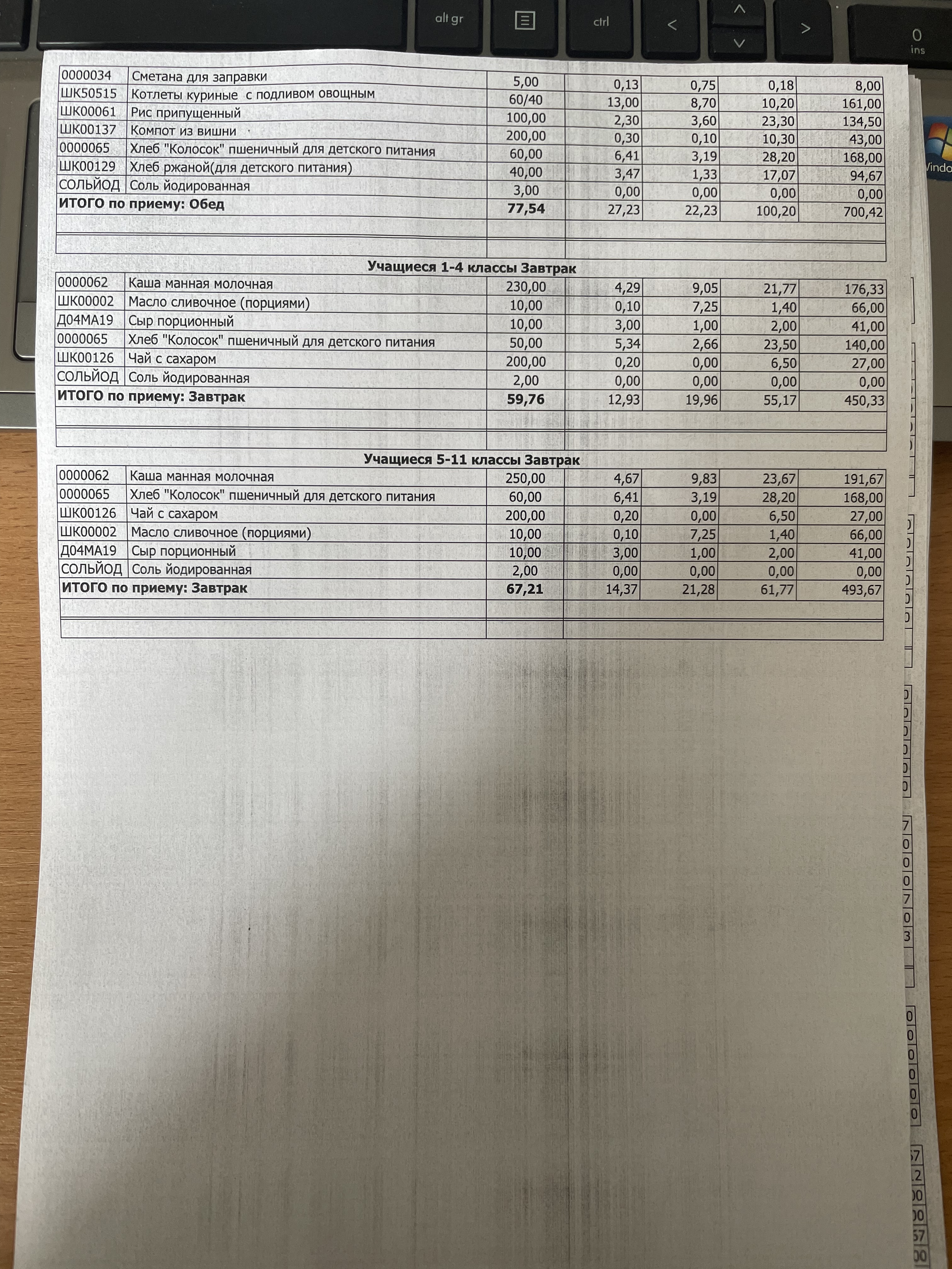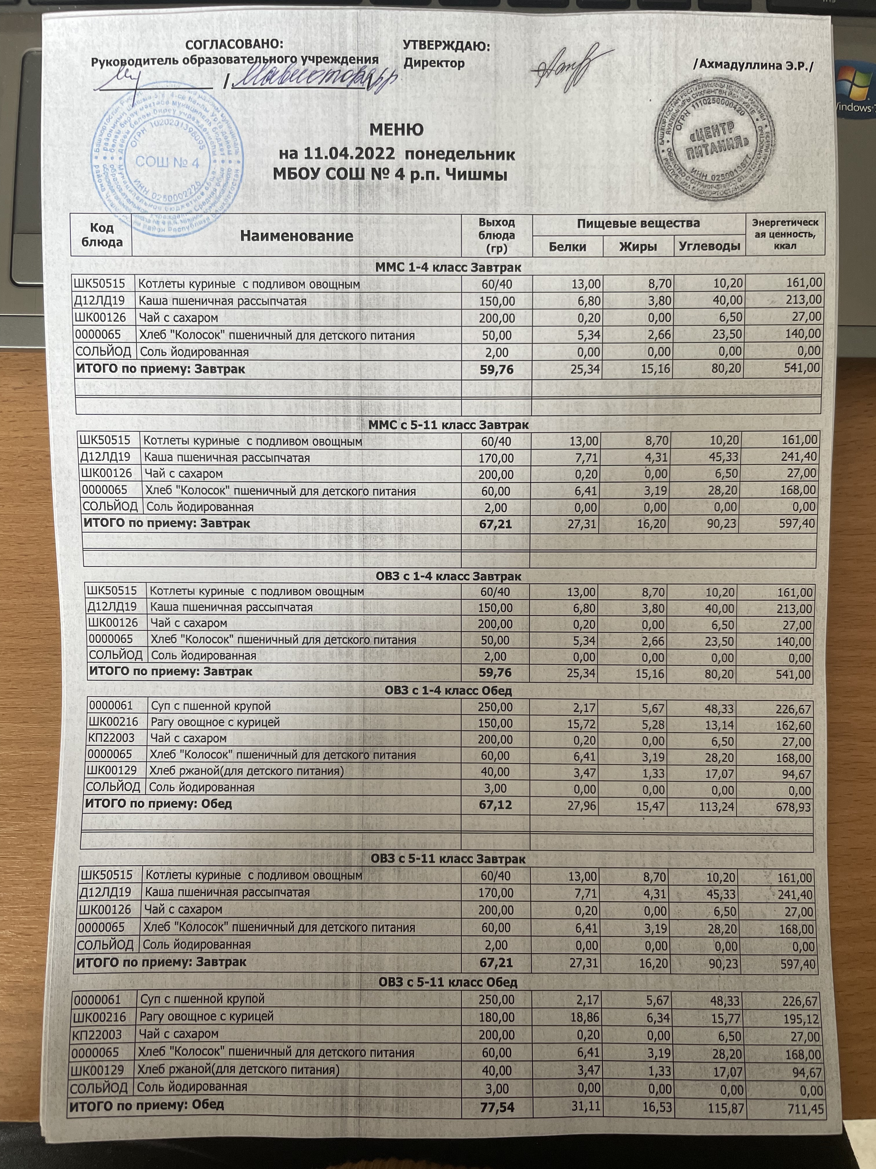 (Фото контрольных блюд )