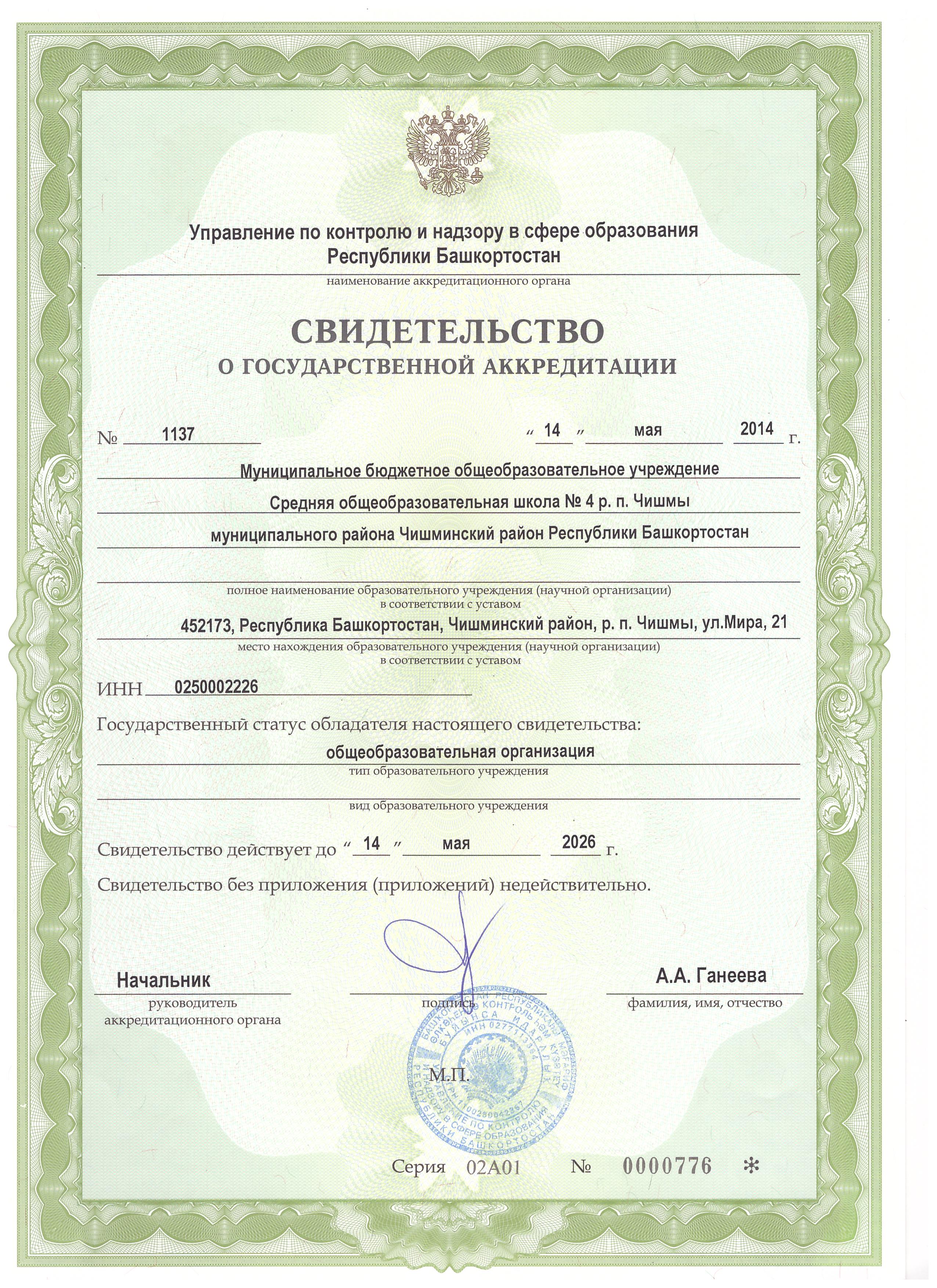 | Полное наименование образовательной организации | Муниципальное бюджетное общеобразовательное учреждение Средняя общеобразовательная школа № 4 р. п. Чишмы муниципального района Чишминский район Республики Башкортостан.